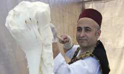 Photo: Mevlud Abursum shows off a big scoop of dondurma, which is Turkish “sticky” ice cream. Credit: Lawrence K. Ho/Los Angeles Times