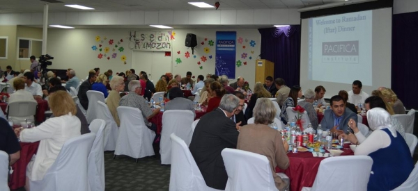 After a quick welcome greeting from Mr. Tezcan Inanlar, the CEO of Pacifica Institute, the call to prayer, signaling that the sun had set and that it was time to break the fast, was what opened up the evening’s program. Faces glowed as stomachs indulged in the delicious meal and hearts indulged in the delicious conversation. Conversations on topics ranging from politics to religion to culture to every-day flowed in the air. If you were to take a quick moment to glance up and just take in the whole room, the picture you were to witness was one to warm your heart and say “Thank you for this wonderful blessing!”